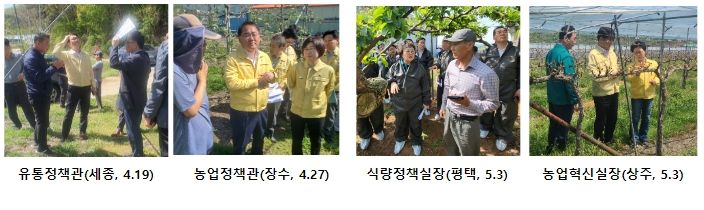 농식품부는 지난 4월 10일 냉해피해 첫 신고 접수 이후, 4월 11일 재해·과수 담당자의 경기도 안성 배 냉해피해 현장점검을 시작으로 4월 19일 세종특별자치시(복숭아, 유통소비정책관), 4월 27일 전북 장수(사과, 농업정책관), 4월 28일 충북 보은(배, 재해·보험 담당자), 5월 1일 전남 나주(배, 농업혁신정책실장), 5월 3일 경기 평택(배, 식량정책실장), 같은 날 경북 상주(포도, 농업혁신정책실장) 등 전국 피해 현장을 점검하고 있다.