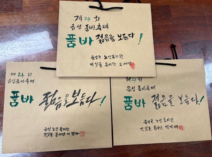 음성군 노인복지관 선배시민봉사단은 단원들이 캘리그라피를 배워서 음성품바축제 성공을 기원하는 메시지를 직접 적은 친환경 종이가방 100개를 기탁했다.