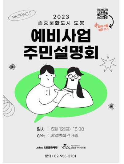 이번 예비사업 주민설명회는 ‘2023 존중문화도시 도봉’ 사업에 주민들의 관심과 참여를 유도하기 위해 마련된 소통의 장으로 문화도시 추진위원 위촉식, 제5차 법정문화도시 지정 기준 및 일정 안내, 2023년 예비사업 소개, 질의응답 등이 진행된다.