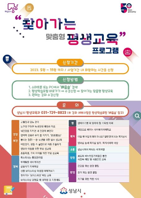 [제주교통복지신문 김강석 기자] 성남시는 오는 11월 30일까지 ‘찾아가는 맞춤형 평생교육 프로그램’을 운영한다.