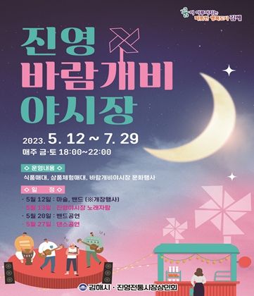 [제주교통복지신문 김강석 기자] 김해시는 오는 12일부터 진영전통시장 일원에서 ‘2023 진영바람개비야시장’을 개장한다. 야시장은 이날부터 11월까지 혹서기 8월을 제외한 6개월간 매주 금, 토요일 오후 6시부터 10시까지 운영된다.