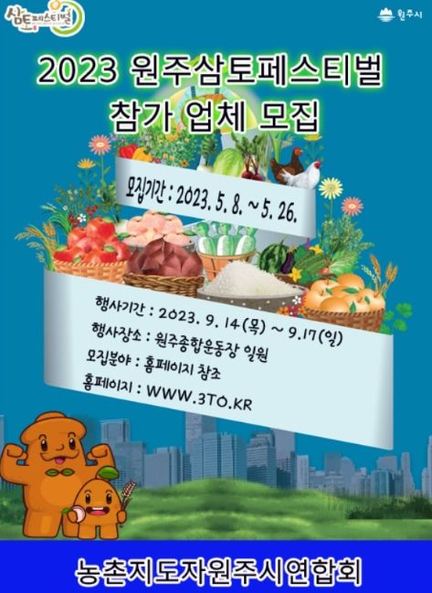 [제주교통복지신문 김강석 기자] 농촌지도자원주시연합회는 오는 26일까지 2023 원주삼토페스티벌 참가업체를 모집한다고 밝혔다.