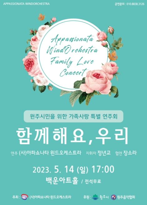 [제주교통복지신문 김강석 기자] (사)아파쇼나타 윈드오케스트라는 오는 14일 백운아트홀에서 원주시민을 위한 가족사랑 특별연주회 ‘함께해요, 우리’를 개최한다고 밝혔다.