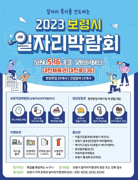 [제주교통복지신문 김강석 기자] 보령시는 오는 16일 대천체육관에서 구직자와 기업의 매칭을 통한 맞춤형 고용지원을 위해 일자리 박람회를 개최한다.
