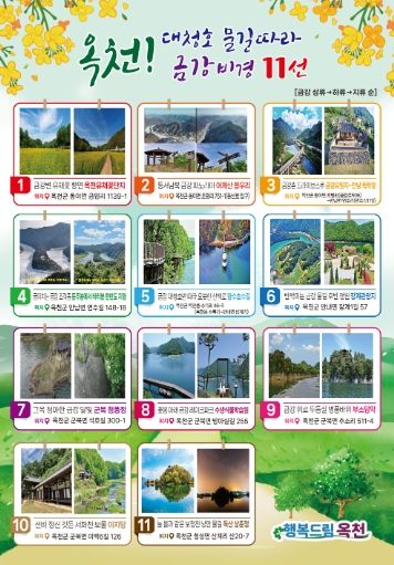 ‘대청호 물길따라 금강비경 11선’은 금강을 따라 펼쳐진 아름다운 옥천의 명소를 잇는 여행길로써, 옥천군은 충북 레이크파크 르네상스 시대에 발맞춰 옥천의 대표적인 여행코스로 홍보하고 지역관광 마케팅 자원으로 적극 활용할 방침이다.