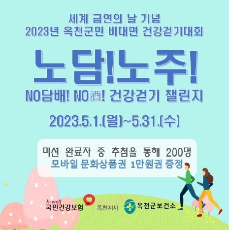 비대면 캠페인으로는 국민건강보험공단 옥천지사와 함께 ‘노담(NO담배)! 노주(NO酒)! 건강걷기 챌린지’를 진행한다. 이 챌린지는 걷기 플랫폼 ‘워크온’을 통해 진행하며 5월 동안 10만보를 걷고 금연·절주 다짐을 사진으로 인증하면 참여가 완료된다.