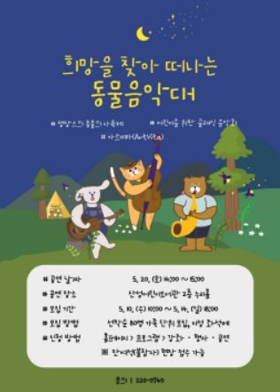 [제주교통복지신문 김강석 기자] 대전학생교육문화원 부설 산성어린이도서관은 어린이를 위한 클래식 음악회 ‘희망을 찾아 떠나는 동물 음악대!’를 유·초등학생 및 가족을 대상으로 5월 20일 토요일 오후 2시에 운영한다고 밝혔다.
