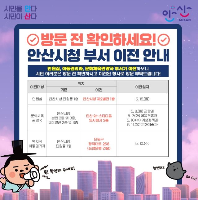 현재 민원동 1층에 위치한 민원실은 오는 15일부터 청사 내 제2별관 1층으로 이전해 업무를 개시하며, 문화체육관광국은 안산 와~스타디움 임시청사 3층으로, 아동권리과는 단원구 광덕대로 258에 소재한 농협 건물로 이전한다.