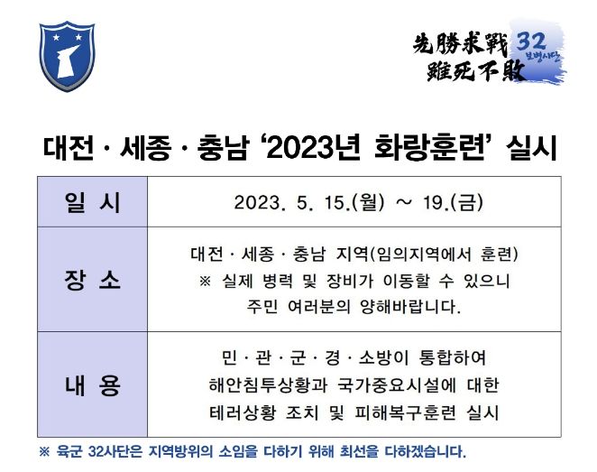 [제주교통복지신문 김강석 기자] 예산군은 오는 15일부터 19일까지 민·관·군·경·소방 통합훈련인 화랑훈련을 실시한다.