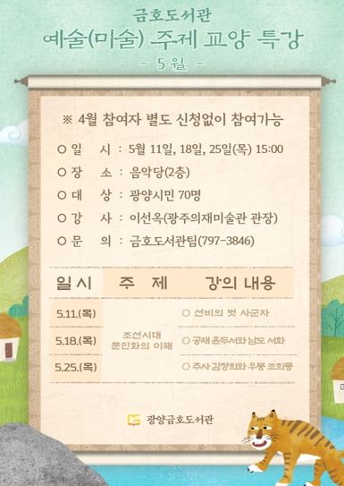 [제주교통복지신문 김강석 기자] 광양금호도서관이 오는 11일 오후 3시, 금호도서관 음악당에서 예술(미술) 특강의 5월 명사로 광주의재미술관 이선옥 관장을 초청해 ‘조선시대 문인화의 이해’를 주제로 강연을 연다.