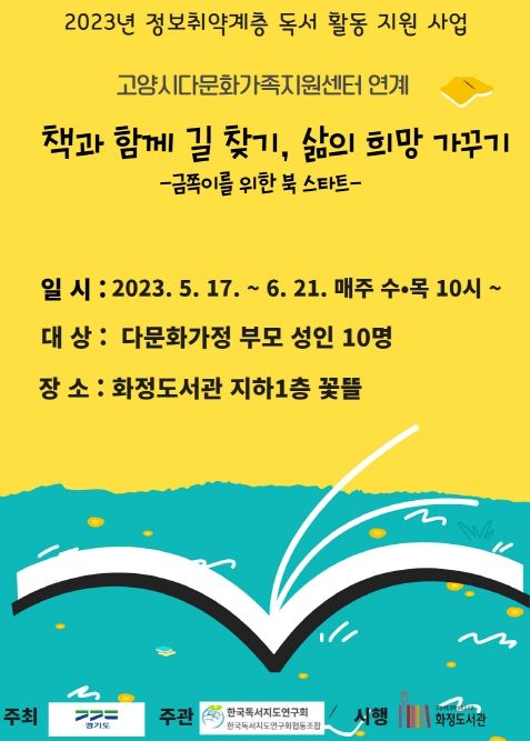 [제주교통복지신문 김강석 기자] 고양특례시 화정도서관이 경기도가 주최하고, 한국독서지도연구회협동조합이 주관하는 ‘2023년 정보취약계층 독서 활동 지원’ 공모사업에 선정됐다.
