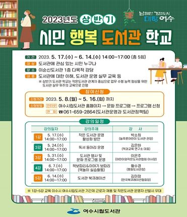 [제주교통복지신문 김강석 기자] 여수시립도서관은 오는 17일부터 6월 14일까지 상반기 ‘시민 행복 도서관 학교’를 운영한다.