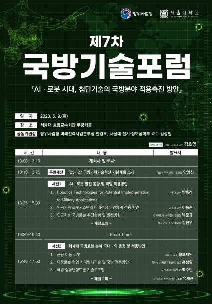 [제주교통복지신문 김강석 기자] 방위사업청은 5. 9일 13시 서울대 호암교수회관에서 ‘AIㆍ로봇 시대, 첨단기술의 국방분야 적용 촉진’이라는 슬로건으로, 국방부 등 군 관계기관, 정출연 및 학계 전문가들이 참석한 가운데 서울대학교와 공동 주관으로 제7차 국방기술포럼을 개최했다.