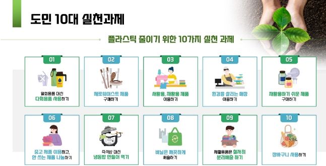 도내 공공기관과 도민의 플라스틱 등 일회용품 사용 줄이기 실천 참여 촉진을 위한 제도를 마련하고, 관광 분야의 플라스틱 줄이기 프로그램을 개발·운영할 계획이다.