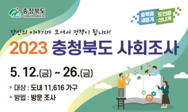 [제주교통복지신문 김강석 기자] 충청북도와 11개 시군에서는 2023년 5월 12일부터 26일까지 15일간 '2023년 충청북도 사회조사'를 실시한다.