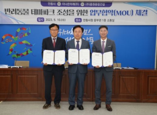 이날 업무협약식에는 권기창 안동시장과 김현동 더나은미래(주) 대표이사 및 김승호 ㈜흥원종합건설 대표이사가 참석했다. 이번 협약으로 안막동 일원에 반려동물 동반 시니어타운과 동물병원 및 펫푸드관, 반려문화시설(펫놀이터, 수영장, 산책로) 등을 포함한 500억 원 규모의 반려동물 테마파크가 조성될 예정이다.