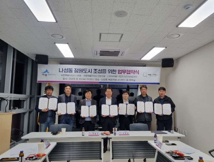 나성동은 10일 주민센터에서 세종특별자치시산림조합, 나성동 공동주택(나릿재마을) 6개 단지 입주자대표회의 회장들이 참석한 가운데 ‘나성동 정원도시 조성을 위한 업무협약’을 체결했다.