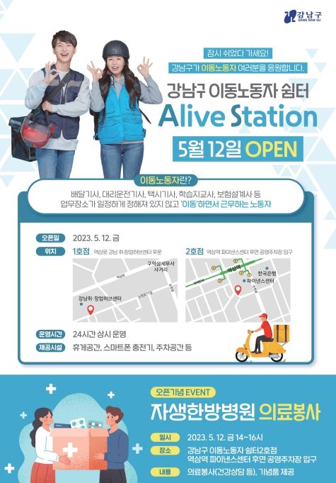 [제주교통복지신문 김강석 기자] 꿈이 모이는 도시, 미래를 그리는 강남구가 역삼동에 이동노동자 쉼터 ‘Alive Station(이하 쉼터)’ 2개소를 조성하고 12일부터 운영을 시작한다.