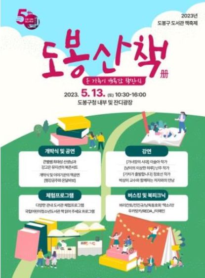 [제주교통복지신문 김강석 기자] 도봉구 도봉문화재단은 가정의 달을 맞이해 오는 5월 13일 도봉구청에서 2023년 도봉구 도서관 책축제 ‘도봉산책(冊)’을 개최한다고 밝혔다. ‘도봉산책(冊)’은 ‘도봉구립도서관을 산책하듯 즐긴다’는 의미를 담고 있다.