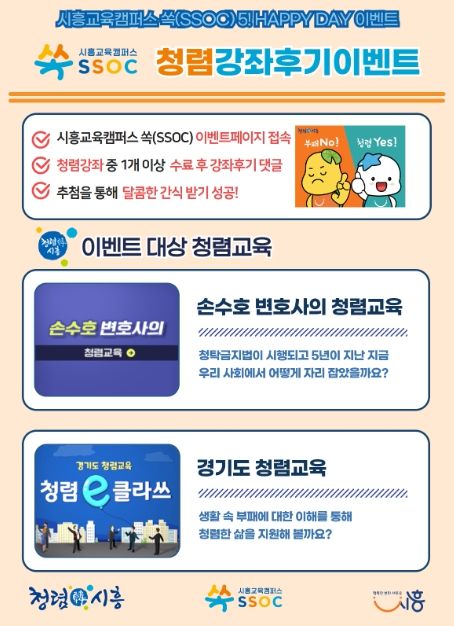[제주교통복지신문 김강석 기자] 시흥시는 누구나, 언제, 어디서나 학습 가능한 소통·참여형 교육 플랫폼 ‘시흥교육캠퍼스 쏙(SSOC)’에서 생활 속 청렴문화 확산을 위한 ‘청렴강좌 학습하기’ 이벤트를 오는 19일까지 진행한다.