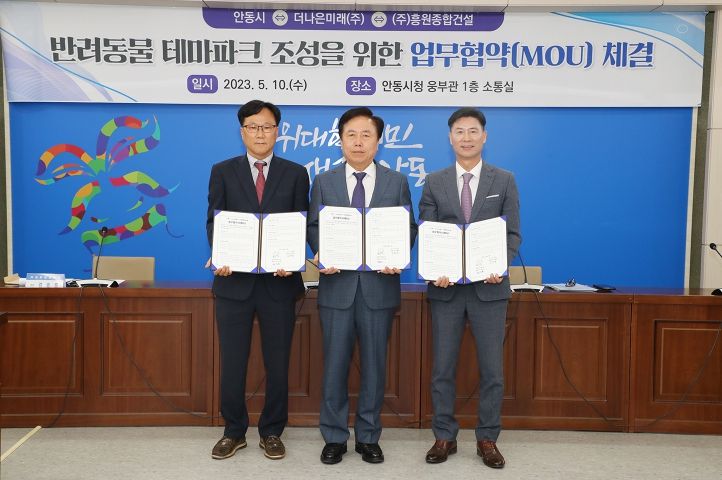 [제주교통복지신문 김강석 기자] 안동시가 더나은미래(주), ㈜흥원종합건설과 함께 10일 시청 소통실에서 반려동물 테마파크 조성을 위한 민관 협력 업무협약(MOU)을 체결했다.