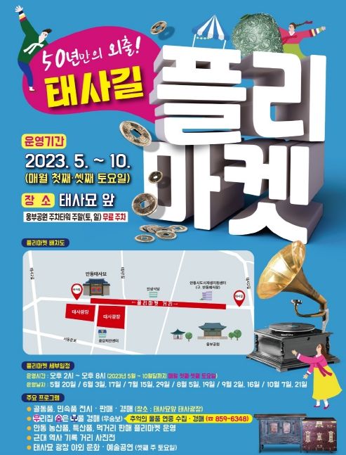 또한, 시는 태사광장 조성과 함께 이곳을 거점으로 태사길 일원을‘안동형 인사동 거리”’로 자리매김한다는 계획이다. 이번 달 20일 토요일 오후 2시부터 8시까지 매월 첫째, 셋째 토요일마다‘태사길 플리마켓’을 운영한다.