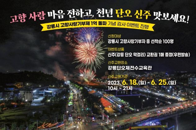 [제주교통복지신문 김강석 기자] 강릉시는 고향사랑기부금 1억 원 돌파를 기념하여 오직 단오제 기간에만 맛볼 수 있는‘신주(강릉 단오 막걸리) 교환권’을 기부자들에게 지급하는 감사 이벤트를 마련한다.