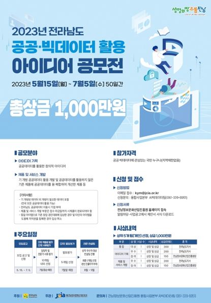 [제주교통복지신문 김강석 기자] 전라남도는 공공·빅데이터를 활용한 창업 아이디어 및 비즈니스 모델 발굴·육성으로 데이터 기반 행정 활성화를 위한 ‘2023년 전라남도 공공·빅데이터 활용 아이디어 공모전’을 개최한다고 밝혔다.