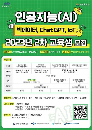 [제주교통복지신문 김강석 기자] 울산시와 울산정보산업진흥원은 6월 14일까지 ‘울산 에이아이(AI)배울랑교(校)’의 2차 교육생을 모집한다고 밝혔다.