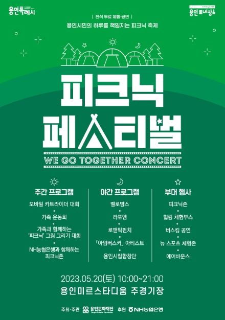 [제주교통복지신문 김강석 기자] 용인문화재단(이사장 이상일)은 오는 20일 용인미르스타디움 주경기장에서 ‘2023 피크닉 페스티벌 – We Go Together Concert’(‘피크닉 페스티벌’)를 개최한다고 밝혔다.