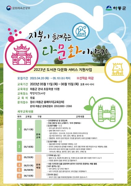 [제주교통복지신문 김강석 기자] 하동군은 악양 작은도서관이 문화체육관광부 주관 ‘2023년 다문화 서비스 지원사업’ 수행기관으로 선정돼 11일부터 내달 15일까지 관내 초등학생을 대상으로 사업을 추진한다고 밝혔다.