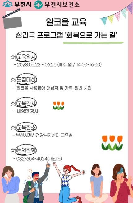 [제주교통복지신문 김강석 기자] 부천시와 부천시정신건강복지센터는 오는 5월 22일부터 6월 26일까지 알코올 교육 심리극 프로그램 ‘회복으로 가는 길’을 운영한다.