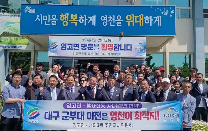 이번 자매결연 협약식에는 이갑균 영천시 산업건설위원장, 신재경 임고면 주민자치위원장 등 우리 지역 환영 내빈과 정병준 범어3동장, 수성구의회 김희섭 의원, 손현규 범어3동 주민자치위원장 등 범어3동 방문단 총 50여 명이 참석했다.