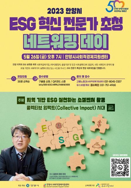 [제주교통복지신문 김강석 기자] 안양시가 ESG(환경·사회·지배구조) 혁신전문가 초청해 특강 및 네트워킹데이를 오는 26일 오후 7시 동안구 평촌동의 안양시사회적경제지원센터에서 개최한다고 11일 밝혔다.