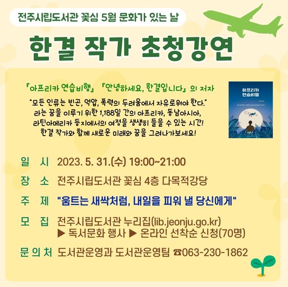 [제주교통복지신문 김강석 기자] 전주시는 오는 31일 오후 7시, 전주시립도서관 꽃심에서 ‘5월 문화가 있는 날 프로그램’의 일환으로 한결 작가 초청 강연을 개최한다.