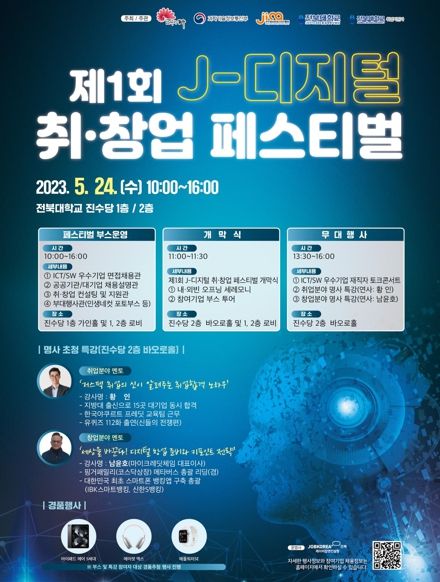 전주시와 전주정보문화산업진흥원, 전북대 SW중심대학사업단은 최근 챗GPT 등으로 확산된 산업 분야의 디지털 혁신에 대응하기 위해 오는 24일 오전 10시 전북대학교 진수당과 구정문 일대에서 ‘제1회 J-디지털 취·창업 페스티벌’을 개최한다.