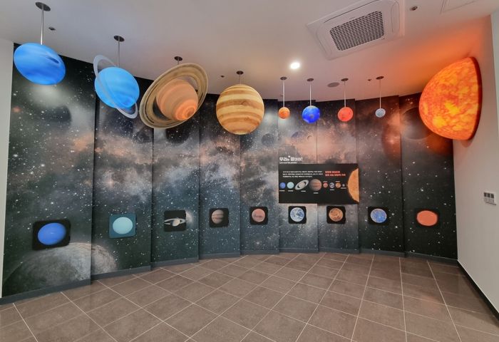 2층에서는 우리나라가 개발 · 발사했던 ‘누리호’와 달 탐사선 ‘다누리호’를 비롯해 태양계에 관한 정보를 제공하고 있으며 생명체가 살 수 있는 조건 등을 게임형식의 콘텐츠로도 살펴볼 수 있도록 했다.