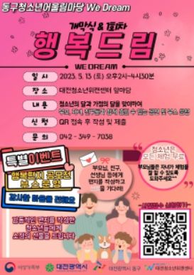 대전 동구가 주최하고 대전 청소년위캔센터가 주관하는 ‘2023 대전 동구 청소년어울림마당 We Dream’이 막을 올리고, ‘개막식과 1회차 행사 행복드림‘이 대전 청소년위캔센터 앞마당에서 개최된다.