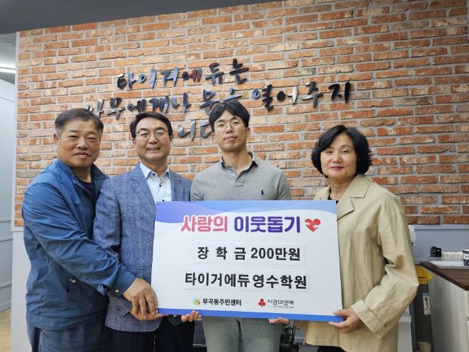 [제주교통복지신문 김강석 기자] 타이거에듀영수학원(의왕시 부곡중앙로 32-2 위치)의 이정호 대표가 10일 저소득층 자녀를 위한 장학금으로 써달라며 성금 2백만 원을 부곡동주민센터에 기탁했다.