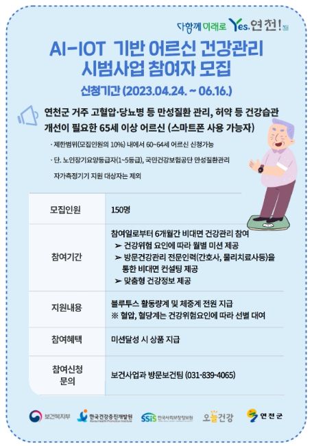 11일 연천군보건의료원에 따르면 ‘AI-IoT 기반 어르신 건강관리사업’은 만성질환을 앓거나 식생활과 운동 습관 교정이 필요한 어르신에게 오늘건강 앱(APP)을 이용해 비대면으로 건강관리를 돕는 서비스다. 사전 건강스크리닝을 통해 제때 약먹기, 매일 걷기, 매일 외출하기, 하루 물 8잔 마시기, 혈압 측정하기, 혈당 측정하기 등 어르신 맞춤형 미션을 제공해 스스로 건강을 관리할 수 있는 힘을 길러준다.