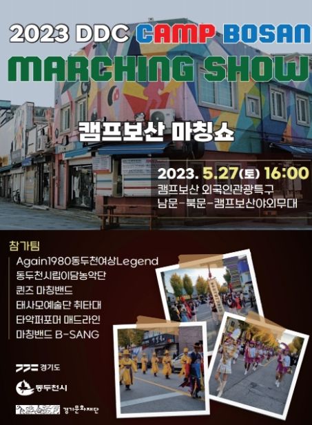 ‘캠프보산 마칭쇼’는 지난해 처음 선보인 지역 문화 행사로 ‘AGAIN 1980 동두천 여상고적대’와 ‘시립이담농악단’, ‘퀸즈 마칭밴드’ 등 전문 예술단체들의 퍼레이드 공연이다.