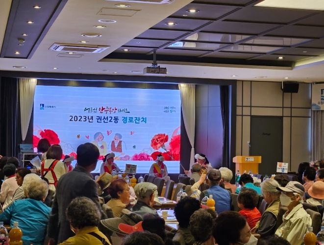 김선기 권선2동장은 "경로잔치를 통해 어르신들이 잠시나마 근심을 잊고 즐기실 수 있는 자리가 됐으면 좋겠다. 앞으로도 노인에 대한 사회적 관심과 경로효친의 사회적 분위기를 만들 수 있도록 지속적인 노력을 하겠다.”고 말했다.