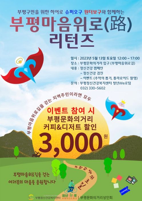 [제주교통복지신문 김강석 기자] 인천시 부평정신건강복지센터가 오는 13일 부평 문화의거리에서 구민의 정신건강 증진을 위해 ‘부평마음위로(路) 리턴즈’ 캠페인을 진행한다.
