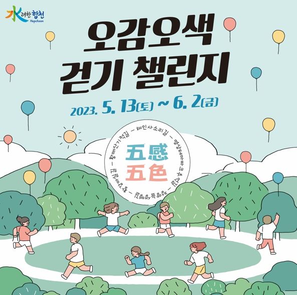 [제주교통복지신문 김강석 기자] 합천군은 오는 13일부터 6월 2일까지 3주간 전자지도를 기반으로 한 모바일 스탬프투어 ‘오감오색 걷기 챌린지’ 행사를 추진한다고 11일 밝혔다.