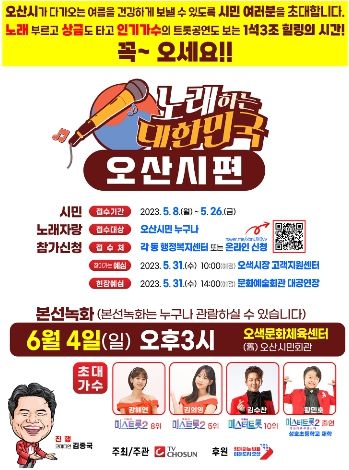 [제주교통복지신문 김강석 기자] 오산시는 오는 6월 4일 오색문화체육센터 대체육관에서 ‘노래하는 대한민국’을 개최한다고 밝혔다.