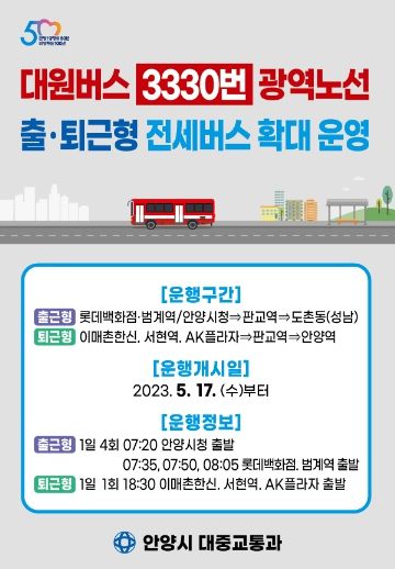 이에 더해, 오는 17일부터는 오전 7시 20분에 안양시청(10095)을 출발해 성남시 도촌동 9단지 앞(06198)까지 운행하는 출근형 전세버스 1대가 추가된다.