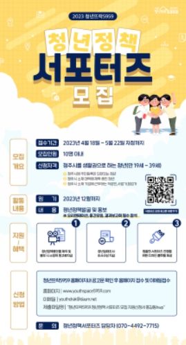 [제주교통복지신문 김강석 기자] 청주시 청년센터인 ‘청년뜨락5959’는 청주시 청년의 정책 참여 확대와 정책 효과성 증진을 위한 ‘2023년 청년뜨락5959 청년정책 서포터즈’를 모집한다.