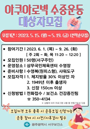 [제주교통복지신문 김강석 기자] 광주광역시 서구는 지역주민의 신체활동 증진 및 건강한 삶을 지원하기 위해 오는 15일부터 19일까지‘아쿠아로빅 수중운동’참여자 50명을 선착순 모집한다.