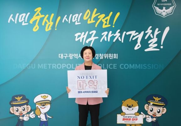 [제주교통복지신문 김강석 기자] 설용숙 대구광역시 자치경찰위원장이 대구지역 두 번째 주자로, 마약범죄 예방 온라인 릴레이 ‘NO EXIT 캠페인’에 참여했다.