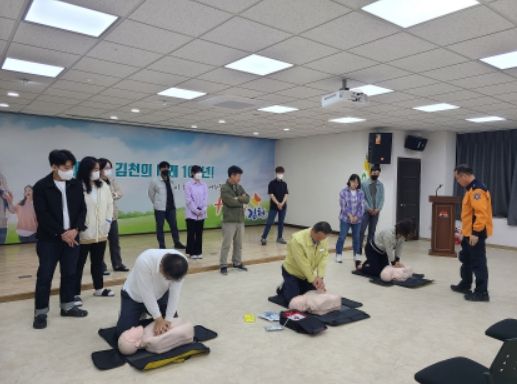 이날 심폐소생술 응급처치 교육은 Happy Together 김천 운동의 하나로 김천소방서 대광119안전센터와 연계하여 실시했고, 손종해 센터장이 강사로 나서 응급상황 발생 시 빠른 대처 요령, 올바른 심폐소생술 방법 등에 대한 이론교육과 교육용 마네킹을 활용한 실습 교육, 자동심장충격기 사용 방법 교육 등을 했다.